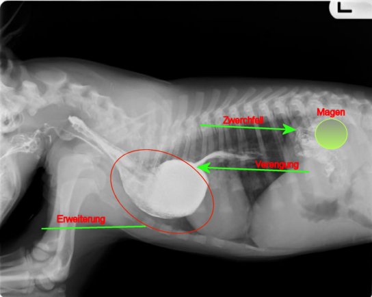 Auf dem Röntgenbild erkennt man deutlich die erweiterte Speiseröhre. Eigentlich ist die Speiseröhre in ihrem ganzen Verlauf gleichmäßig dick.